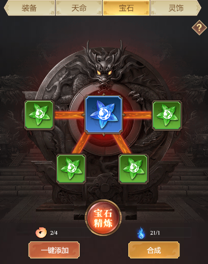 2、4颗不同类型的宝石进行合成时,则随机合成任意一个类型的更高一级宝石