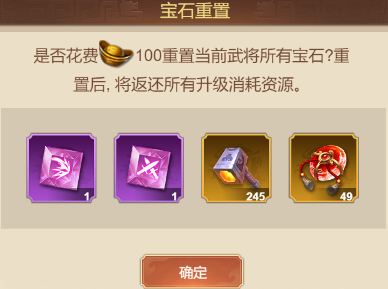 消耗元宝可以重置当前武将的所有宝石,并返还所有升级消耗资源,缺少资源的主公大人可以自行重置宝石来获取所需资源。