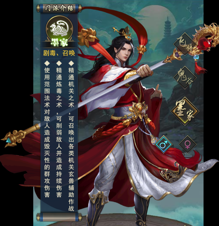 墨者有锋,却兼爱非攻。有着玄奥的机关玄兽术,毒术,和伤害最强的墨攻眀鬼术                                            (隐于闹事,好为游侠,不出仕途,捍卫墨家正道)