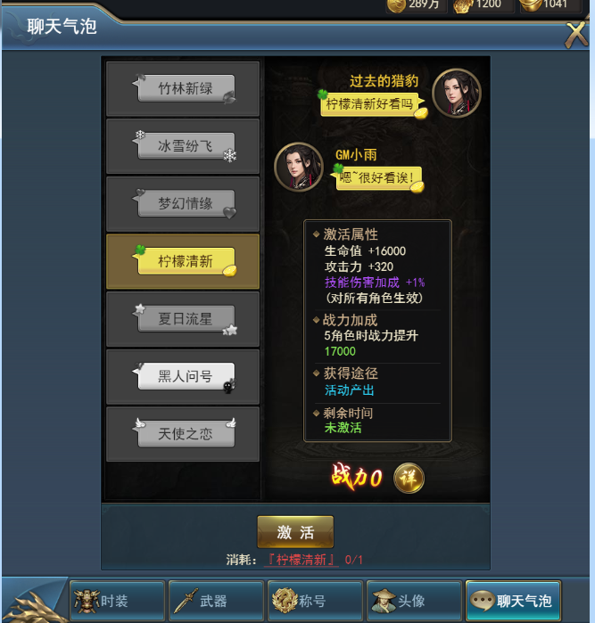 打开界面后玩家可预览聊天气泡的造型以及激活后附加的属性