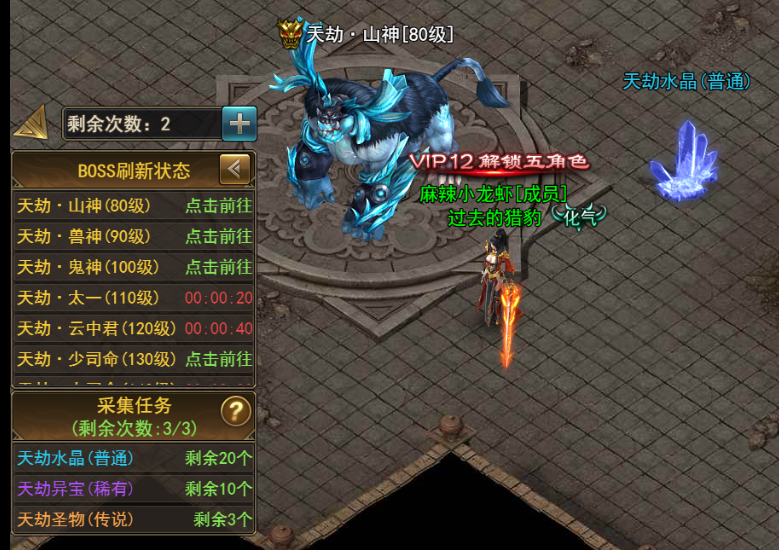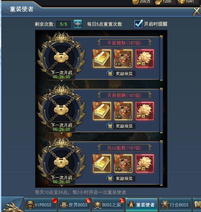 每个VIP BOSS每日只能挑战一次,每日5点将重置可挑战的最高等级的两个VIPBOSS挑战次数。