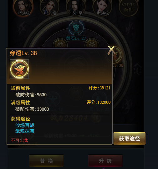 沙场百战产出的奖励为“武魂”,将武魂镶嵌进入角色中将提供大量属性。