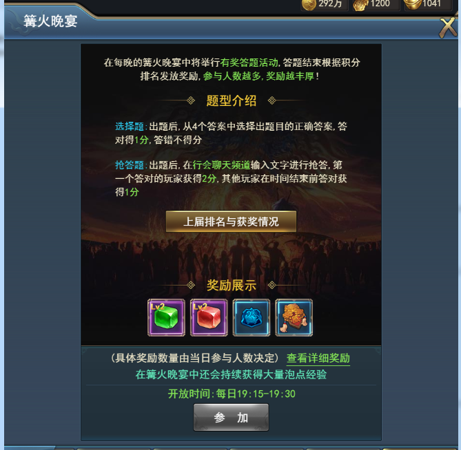 进入场景后系统将依次提出一定数量的选择题或抢答题,场景中参与的玩家根据回答的速度与准确度累计积分,答题结束后将根据积分排行榜发放活动奖励。