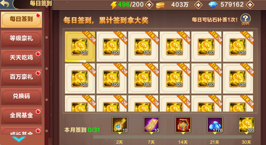 游戏内签到活动,每天签到赠送大量刷充币。