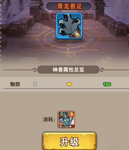 神兽升阶需要消耗大量神兽碎片,如凡品青龙升到下品青龙需要四个部位均达到5级,而每次升级需要10个青龙碎片