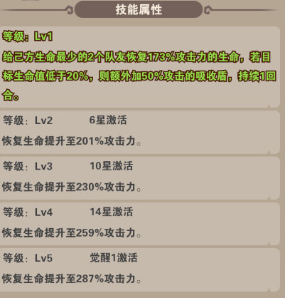 技能:全体恢复生命并提升防御(恢复生命石根据自身攻击力结算的,所以攻击力叠高),