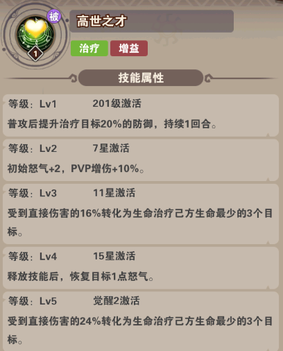 技能:全体治疗,赋予后排减伤护盾,被动敌方全体减怒