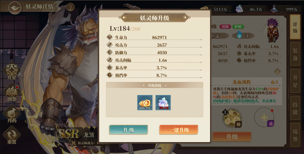 妖灵师可以通过消耗升级材料(妖晶币、龙元灵液)提升等级,而升级可以提升面板属性,当达到等级上限时可以通过消耗妖晶币、龙元灵液和九转丹进阶等级上限。不过前期资源有限,还是尽量避免将养成材料分散给太多角色,练好一队主力队伍能过主线才是最重要的。