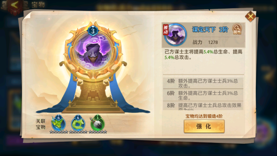 2,每一组宝物凑齐可以激活技能,技能可以给少主的武将,谋士提升很高的属性。